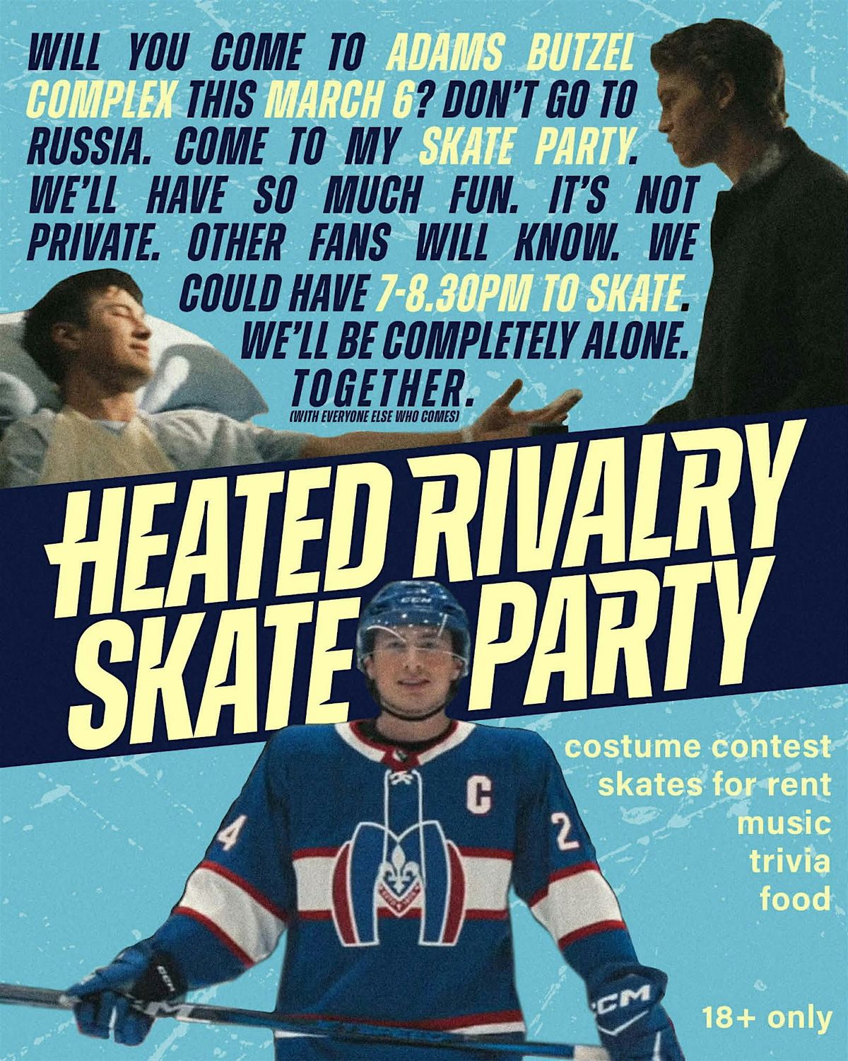 Join us at the Adams Butzel Complex indoor ice skating rink (10500 Lyndon St) for a Heated Rivalry Skate Party on Friday, March 6, 2026, from 7 to 8:30 p.m.! There will be music, a Heated Rivalry trivia game, a light-hearted costume contest, snacks, and the opportunity to have some fun with fellow fans. Skates are available for rent up to size 13 on a first come, first served basis. Attendees must be 18+.