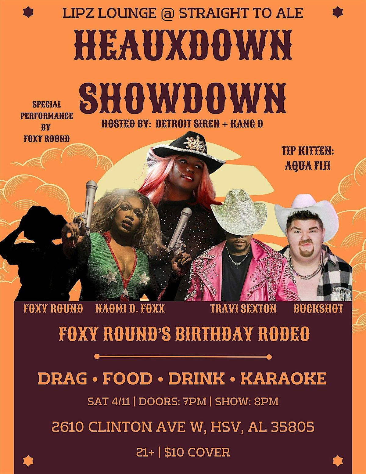 WHY HOWDY YALL! Come enjoy your favorite country cowboys and cowgirls at this birthday rodeo! We have Huntsville’s best performing, and wouldn’t ya know it? The wind seems to have brung in the great Travi Sexton from Nashville. Come turn up and celebrate my girl Foxy Round who has her own number in the show! This town is big enough for all of us, so invite a friend and dress up with us if you’re feeling it!