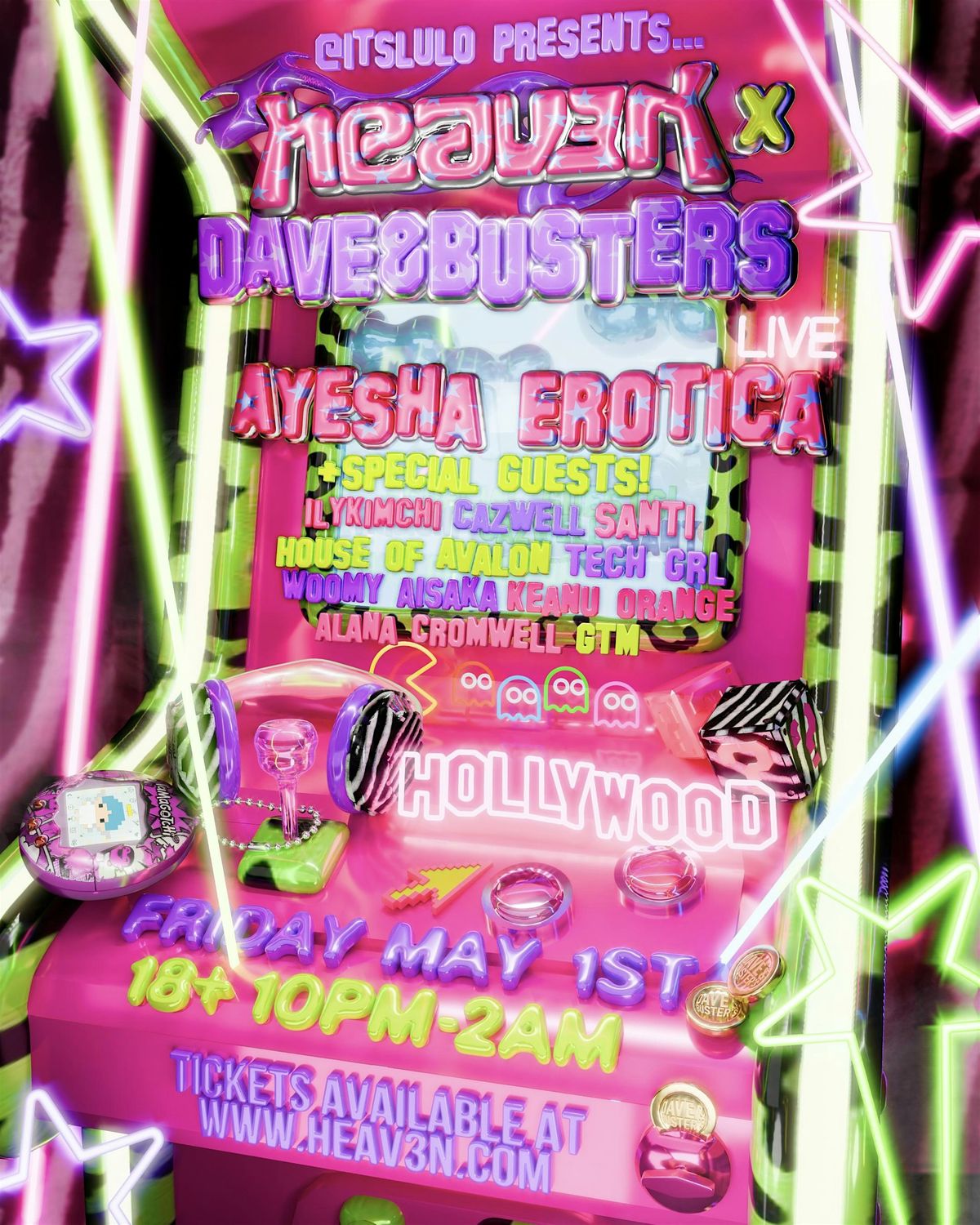 Join us in Hollywood as we takeover Dave & Busters w/ a live performance by the queen Ayesha Erotica + many more!! 💓 This is going to be a fun one 0;-) get ur tix while they last!!! www.heav3n.com 💓18+ // 10-2AM\