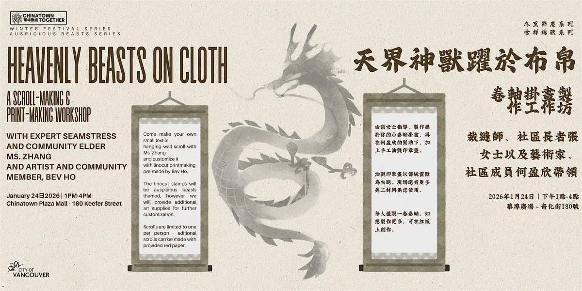In this workshop, participants will create their own small hanging wall scrolls with guidance from Ms. Zhang, who will assist with or pre-sew the textile components. You’ll then personalize your scroll using custom, handmade linocut stamps by Bev Ho, featuring traditional Chinese auspicious beasts, symbols of luck, protection, and prosperity. Each scroll will be uniquely yours, perfect for adding a meaningful and hopeful touch to your home for the year ahead.