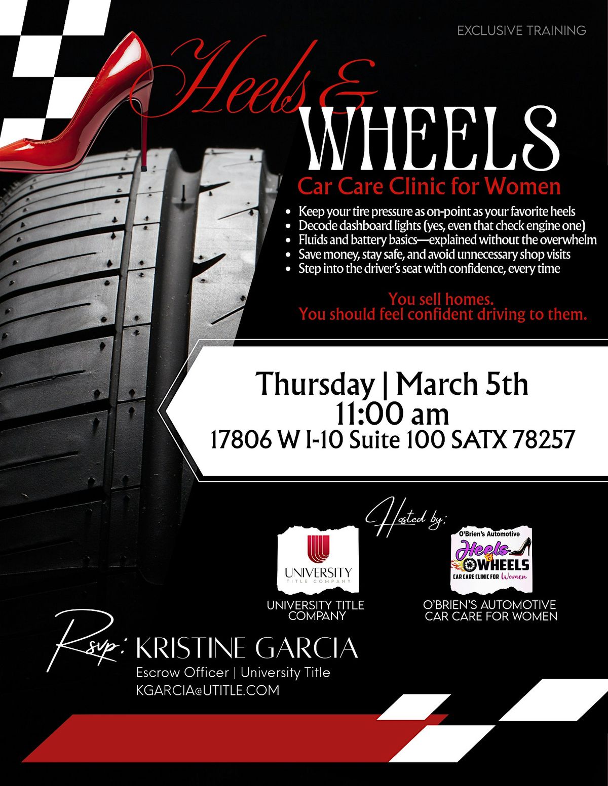 Heels & Wheels: A Car Care Clinic Just for You!You’re a pro at finding the perfect home it’s time to feel just as confident in your ride. As women in real estate, we practically live in our cars! But let’s be honest: seeing a random light pop up on the dashboard or worrying about a low tire can be a total headache during a busy day of showings.Join your friends at University Title Company and the experts from O’Brien’s Automotive for a relaxed, empowering morning designed to take the "scary" out of car maintenance. This is a judgment-free zone where we’ll break down the basics so you can stay safe, save money, and keep rolling with confidence.What we’ll chat about: