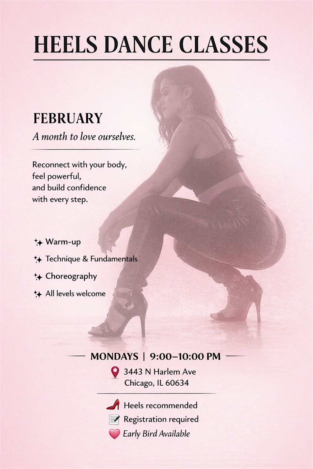 Confidence, good vibes, no pressure. Beginner-friendly heels class for all levels just come, move, and enjoy. 🗓 Every Monday ⏰ 9:00 PM – 10:00 PM 📍 3443 N Harlem Ave, Chicago, IL 60634 💰 Early Bird: $50 / month + eventbrite fees(ends 01/24/26)