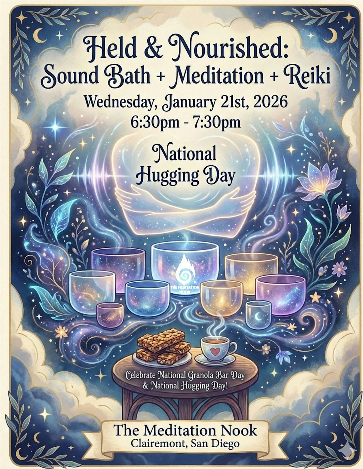 Welcome to The Meditation Nook for an evening of relaxation and rejuvenation at Held & Nourished: Sound Bath + Meditation + Reiki. Join us for a blissful experience that will soothe your mind, body, and soul. Let the harmonious sounds wash over you during the sound bath, followed by a guided meditation to center your thoughts. The event will conclude with gentle Reiki energy healing to restore balance and vitality. Come unwind and find your inner peace with us!