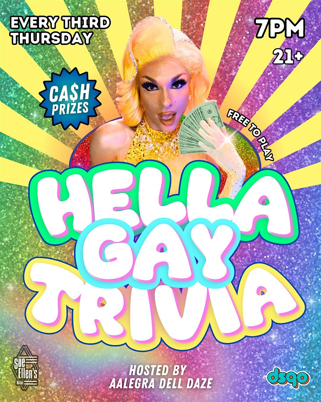 It's time for Hella Gay Trivia!! Join us at Sue Ellen's every 3rd Thursday of the month for a night of trivia, prizes, and drinks hosted by Aalegra Dell Daze and Karri! All four trivia categories will be share on our social media (Instagram: @dsqodallas)