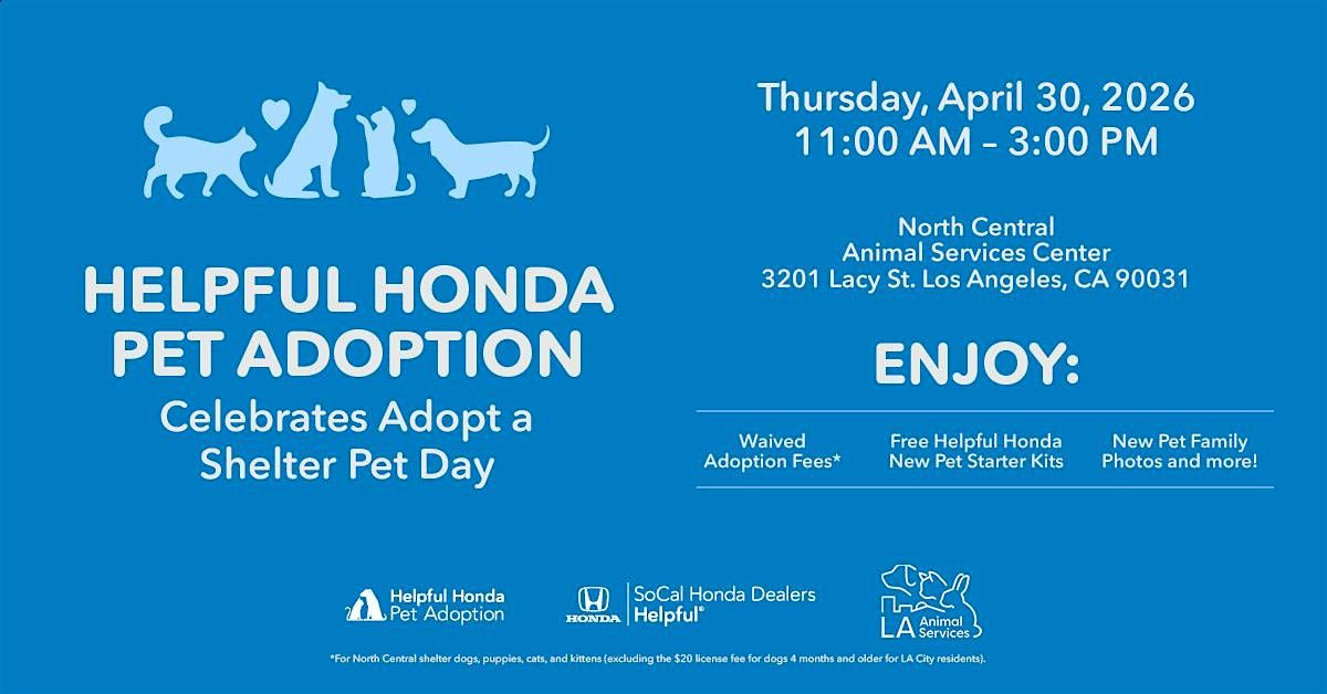 In celebration of National Adopt a Shelter Pet Day on April 30, Helpful Honda is partnering with LA Animal Services to host a special pet adoption event at the North Central Animal Shelter location. The event supports local animals in need and helps alleviate overcrowding at shelters while connecting Los Angeles families with their newest furry companions. Visitors can find their new best friend and enjoy Waived Adoption Fees; complimentary Helpful Honda New Pet Starter Kits including a bed, food, and treats; and new pet family photos. Helpful pet supplies will be gifted to new pet parents through May 3, while supplies last. SoCal Honda will also make a helpful donation to LA Animal Services as part of the event.