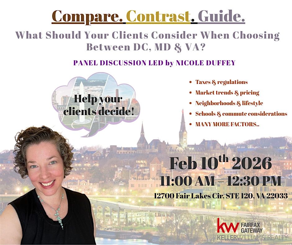 Join us for an expert panel discussion designed to help real estate professionals better guide their clients when deciding between Washington, DC, Maryland, and Virginia.
