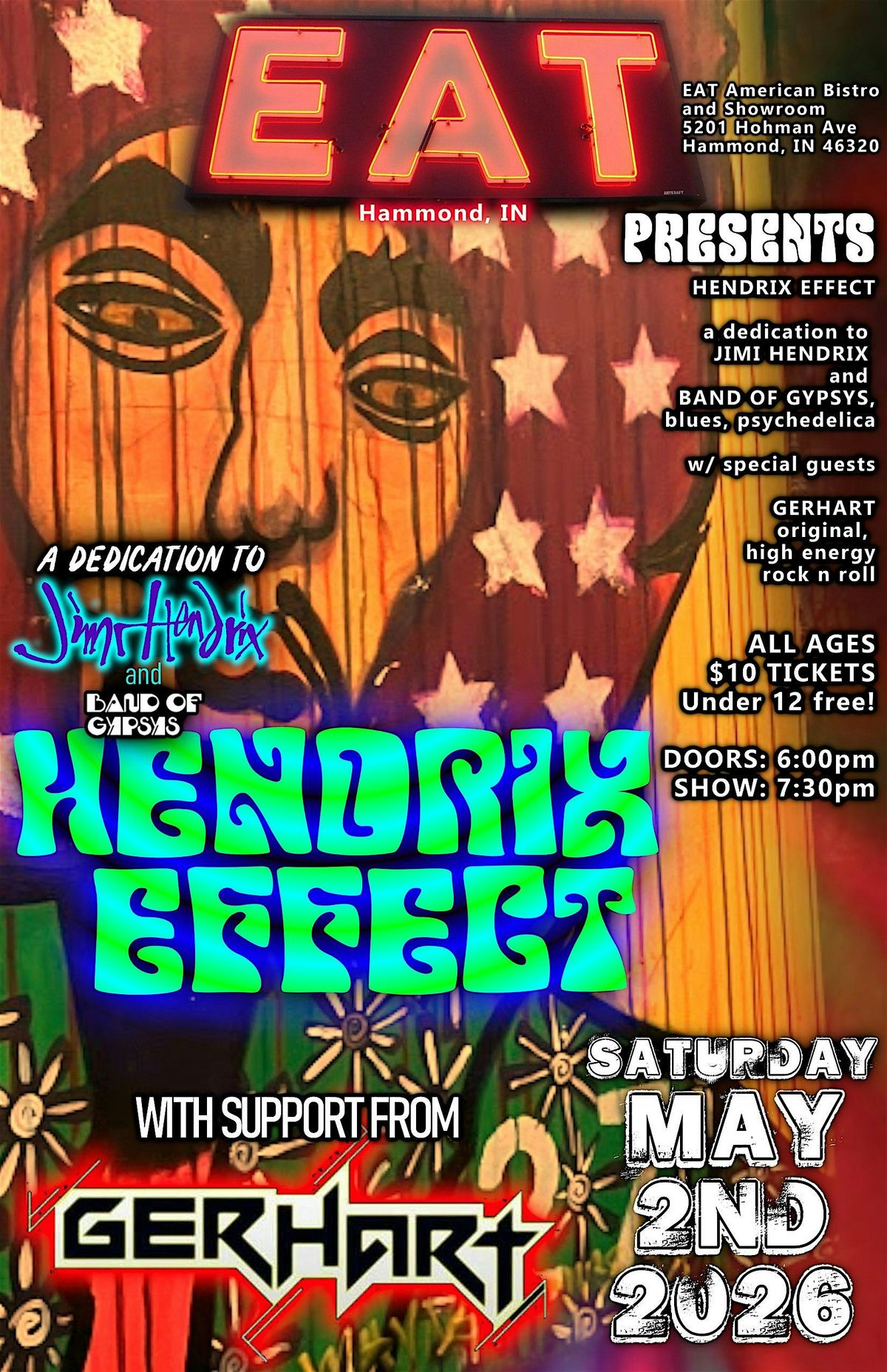 Get ready for an epic night in person as Hendrix Effect teams up with Gerhart to bring the vibes only EAT can deliver. Great tunes, awesome crowd, and unforgettable moments await you! "Hendrix Effect" is Northwest Indiana's Jimi Hendrix dedication band. Gerhart is high energy, ALL ORIGINAL, rock n roll, from Dyer, IN.