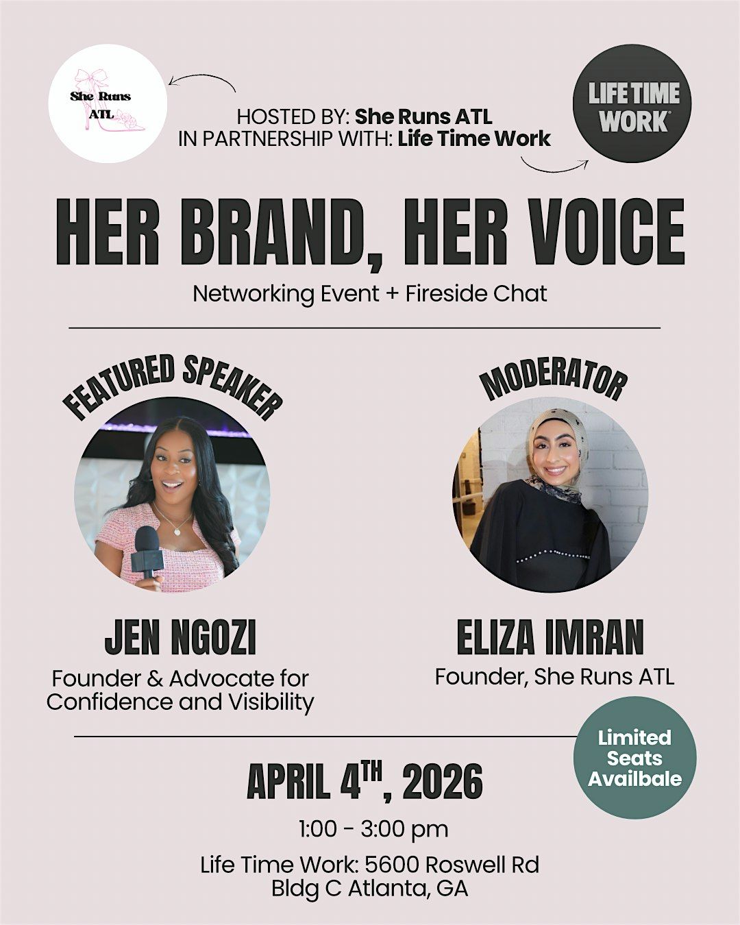 This special event features a fireside chat with a featured speaker, moderated by She Runs ATL founder Eliza Imran, where we’ll dive into the realities of building a personal brand, showing up confidently, and navigating the journey of entrepreneurship.