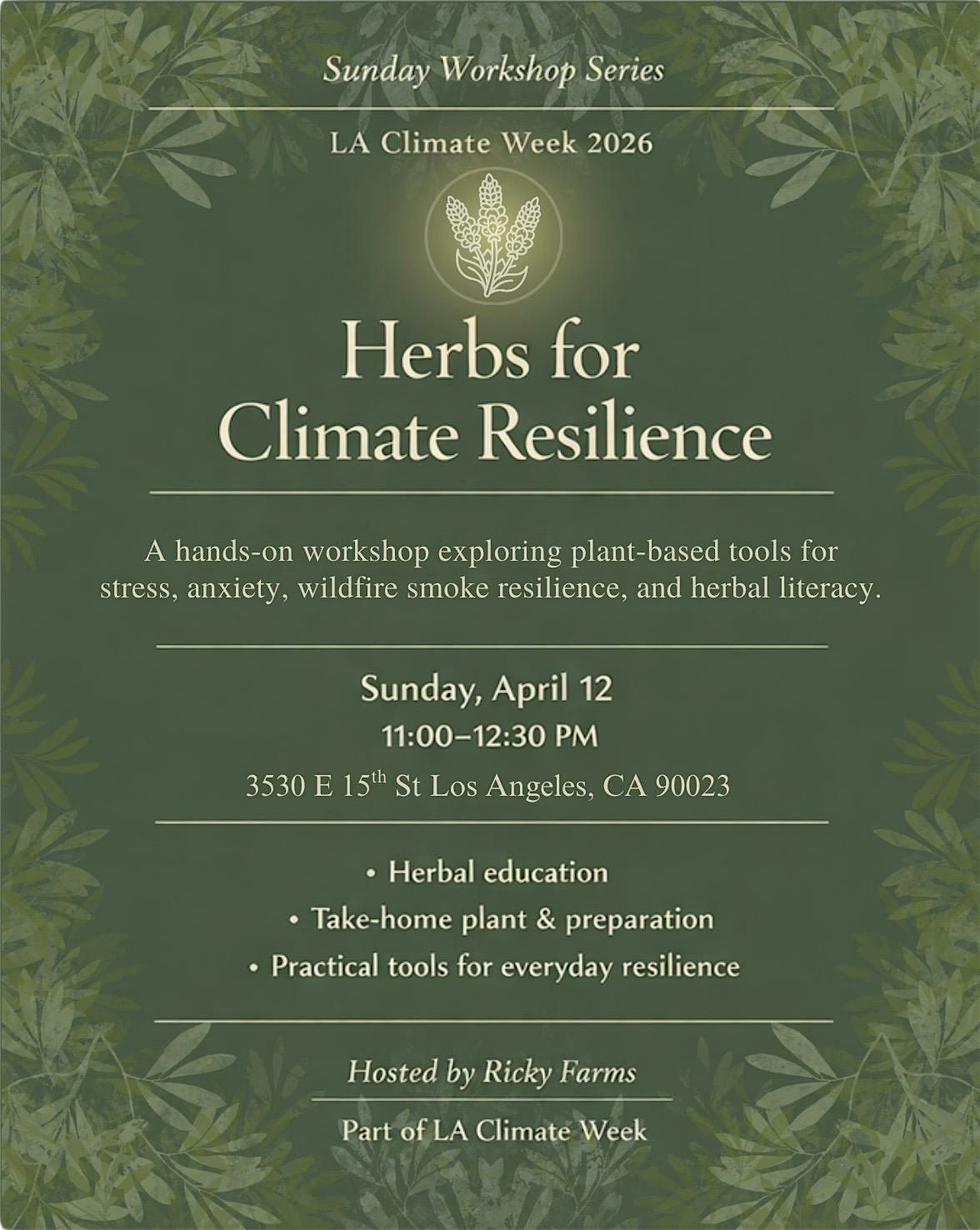 Join us for an exciting in-person event all about how medicinal herbs can help us adapt and thrive in changing climates. As part of LA Climate Week 2026, this hands-on workshop will equip you with plant-based tools for nervous system regulation, wildfire smoke resilience, and overall herbal literacy. Participants will take home a living medicinal plant, get to create an herbal tea preparation, and leave with an in-depth knowledge of herbs for mental health. It's a fun, hands-on way to connect with nature and boost your herbal knowledge.