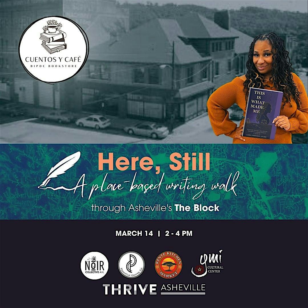 Here, Still: A Writing Walk Through The Block in Downtown Asheville is a ticketed, two-hour community-centered Asheville writing workshop designed to reconnect residents and visitors with downtown through storytelling, creative placemaking, and intentional engagement with locally owned businesses. Centered on The Block, Asheville’s historic Black cultural district, this guided writing experience, facilitated by local author, Aisha Adams, invites participants to explore downtown as a space of memory, labor, belonging, and future possibility.