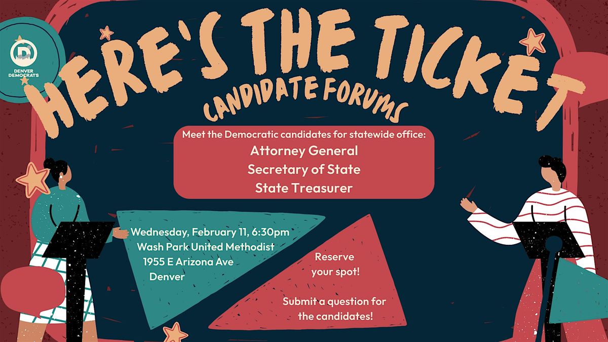 Here’s The Ticket is a candidate forum designed to help Democratic voters get to know the contenders for Colorado’s 2026 statewide races for Attorney General, State Treasurer, and Secretary of State. This is the first of a series of candidate forums, with this event hosted by House District 1 and House District 2!