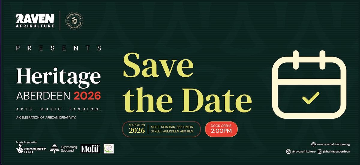 Heritage Aberdeen 2026 is a flagship cultural event designed by Raven Afrikulture to celebrate and integrate the depth of African art, music, and fashion into Aberdeen's cultural landscape. Inspired by the success of the Afro Indie Series, this event will be an immersive, multi-disciplinary experience showcasing the brilliance of Black creatives from Aberdeen, Scotland, and the wider African diaspora. The goal is to elevate cultural representation, drive economic opportunity for Black entrepreneurs, and foster stronger community connections. We seek partners and sponsors to co-create an unforgettable experience.Disclaimer: