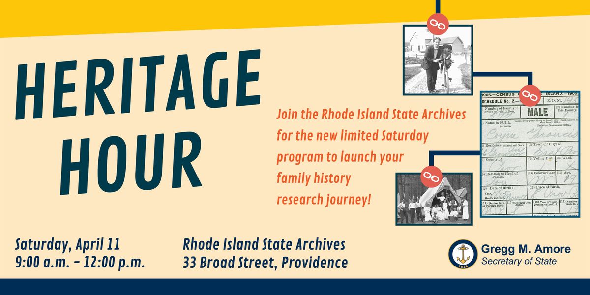 Join the Rhode Island State Archives for Heritage Hour, the new limited Saturday program to launch your family history research journey! This event offers access to the Archives outside of regular hours and will feature examples of vital records in the State Archives collection. Staff will be available to review how to use digitized vital records and share best practices on how to begin genealogical research.