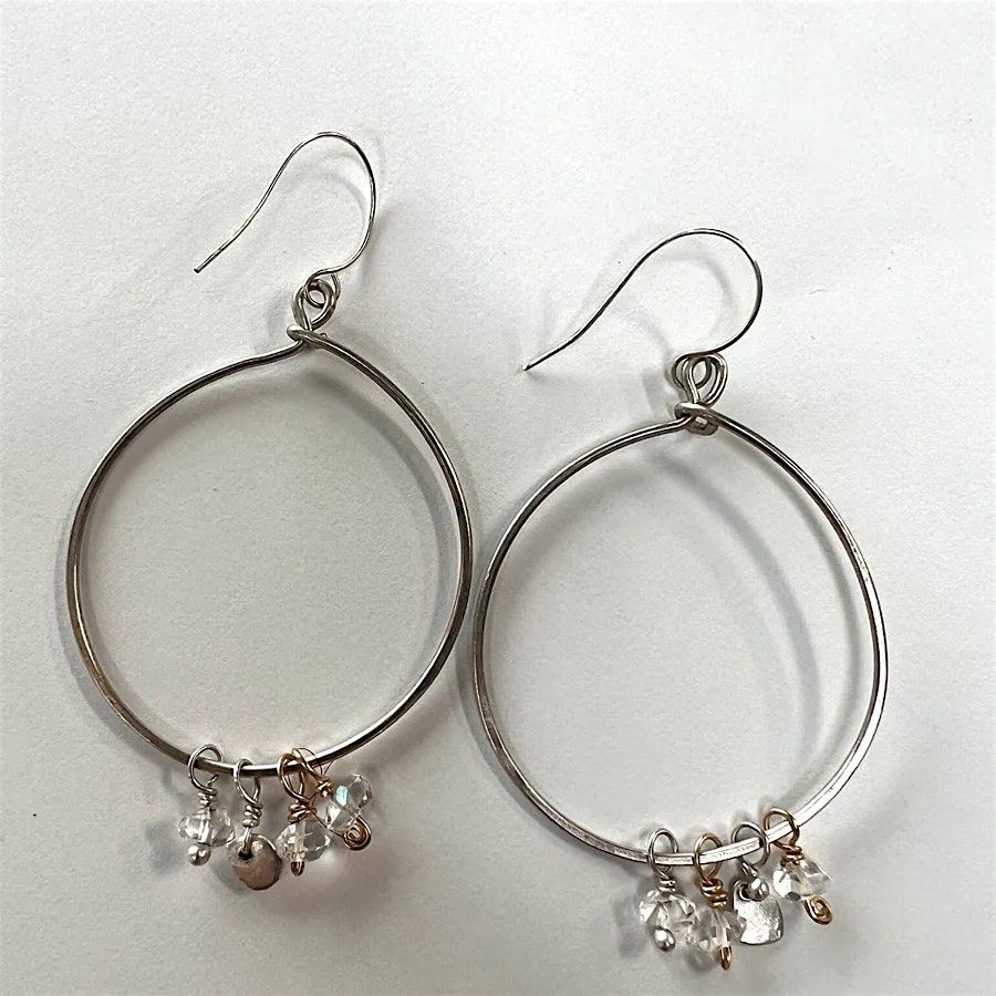Join us for our new jewelry workshop with local artisan, Lisa Schaffer Doggett. In this workshop, you will learn to create a pair of gorgeous Sterling silver earrings with Herkimer Diamonds. Lisa will teach you basic wire wrapping techniques, which include making hook and eye clasps, and an earring wire with basic forming techniques.