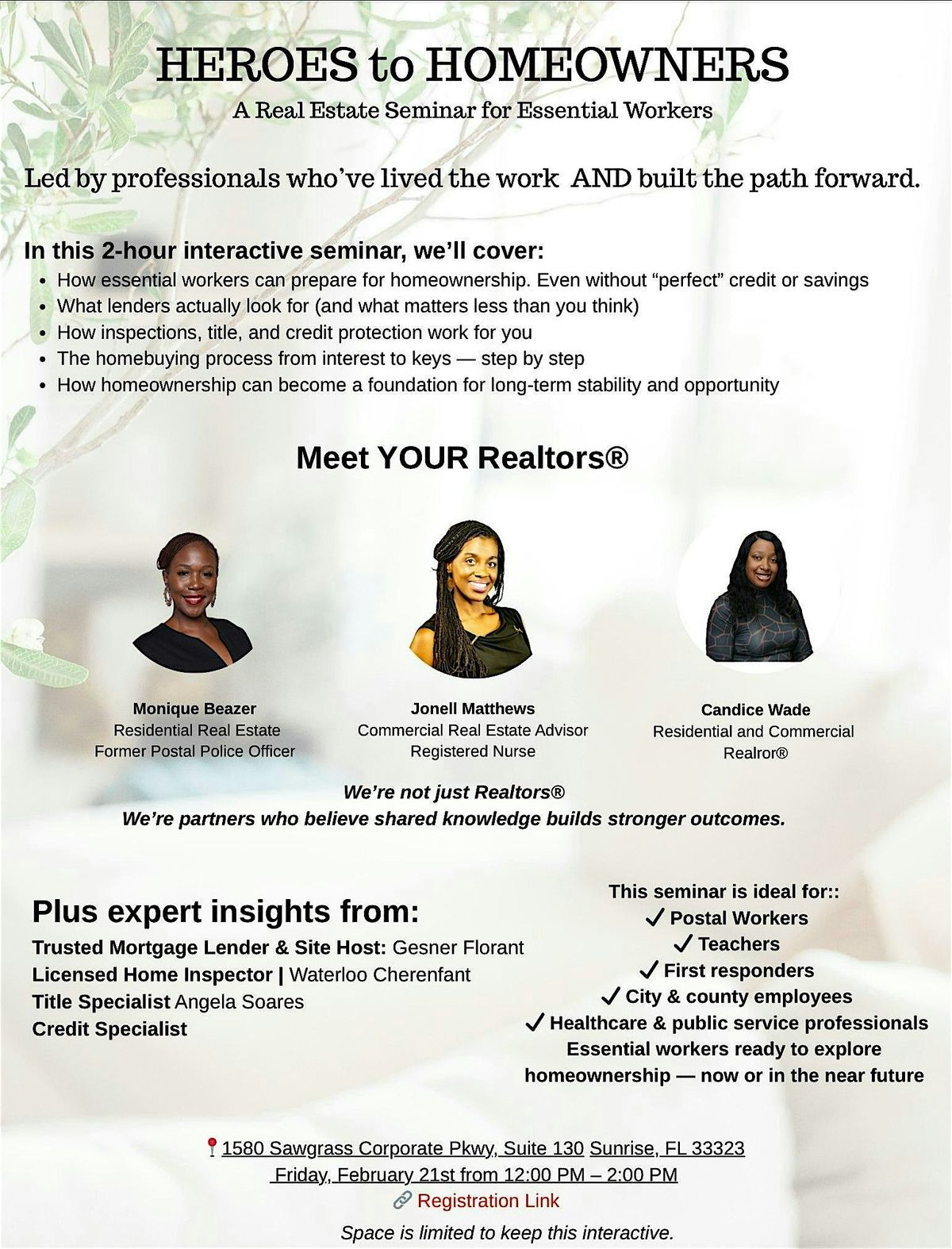 Are you an essential worker dreaming of buying a home but not sure where to start? This workshop is for YOU! Join us for a powerful, information-packed session designed to educate and empower essential workers—teachers, healthcare, public safety, transportation, postal workers, hospitality, and more—on the path to homeownership.