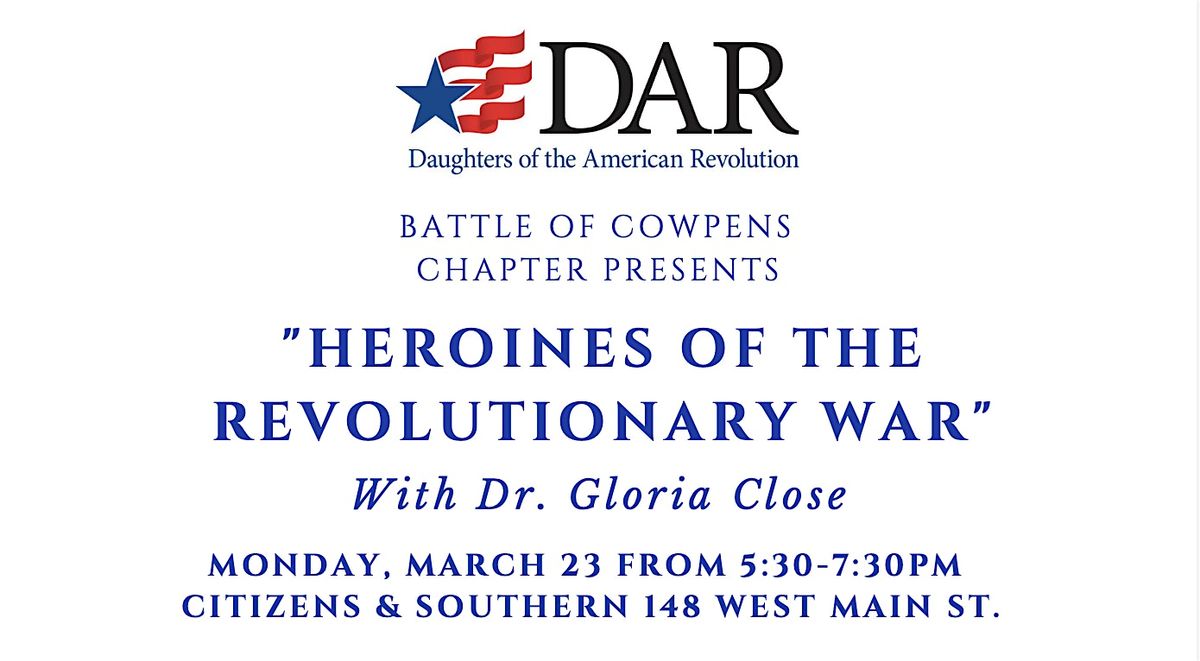 Join Dr. Gloria Close, the Spartanburg 250 Committee, and the DAR Cowpens Chapter on Monday, March 23 to learn more about Eliza Lucas Pinckney, Jane Thomas, Kate Barry, Sarah Fulton, Nancy Hart (Wahatche), Mary Ludwig Hays, Deborah Sampson, Mammy Kate, Phillis Wheatley, and Hannah Till.