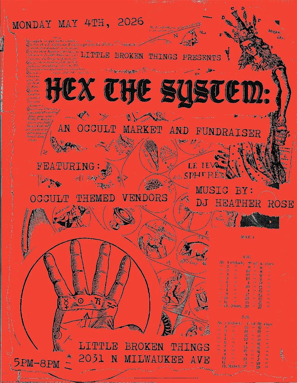 Hex the System: An Occult Fundraiser and Market hosted by Little Broken Things. Cultivated to bring together our community and support ICIRR + Pilsen Food Pantry. We are waiving the ticket fee and are instead asking for in-kind donations we can donate directly to the Pilsen Food Pantry. We will will have tons of raffle prizes comprised of donated goods from local, artists, musicans, and small businessess. We will be selling raffle tickets, selling HEX THE SYSTEM tshirts and so much more! Come by, support your community and listen to DJ Heather Rose spin some records. Let’s keep ICE out and stand together in protection, solidarity, and support.