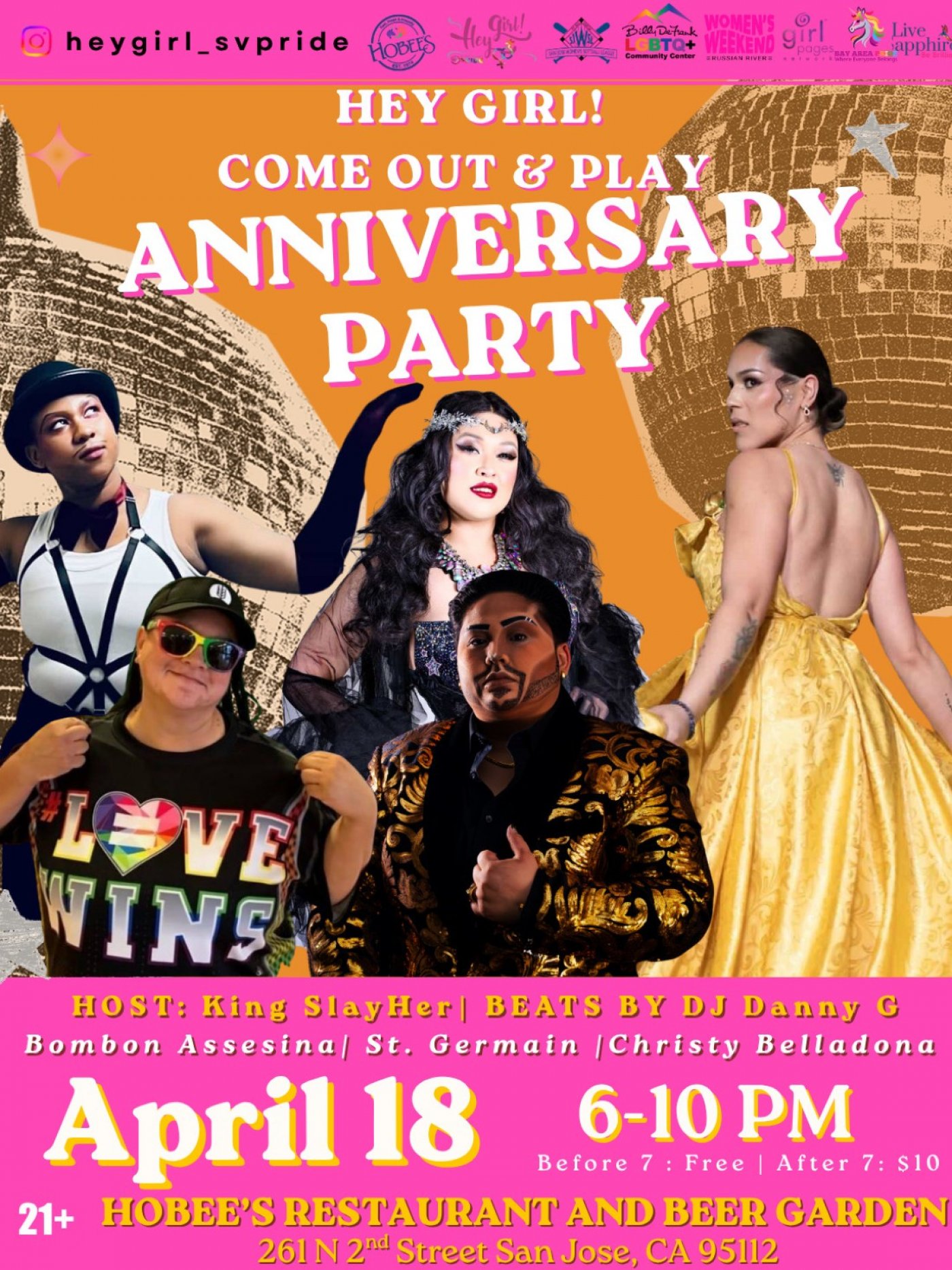 Hey Girl! (part of Silicon Valley PRIDE) throws the South Bay's only queer women+nonbinary+trans dance party every 3rd Saturday of the month! All members of the 2SLGBTQIA+ community are welcome!