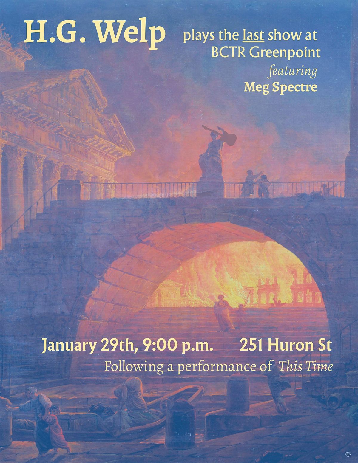 Come see H.G. Welp live featuring Meg Spectre at our last show at BCTR Greenpoint. Follows a performance of This Time by Matthew Gasda.About this Event