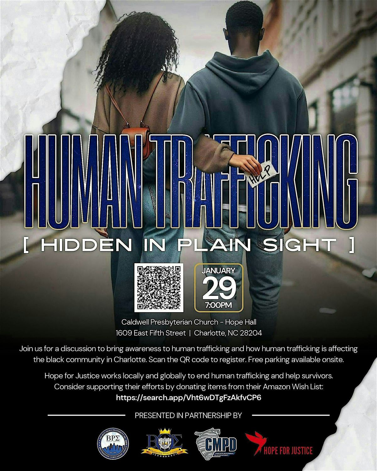 The Beta Rho Sigma Charlotte Alumni Chapter of Phi Beta Sigma Fraternity, Incorporated & the Beta Omicron Sigma Chapter of Sigma Gamma Rho Sorority, Incorporated present Hidden In Plain Sight. This event will discuss human trafficking basics, red flags and indicators of a possible victim and various techniques. Hidden In Plain Sight will take place at Caldwell Presbyterian Church in the Hope Hall. Refreshments will be served.