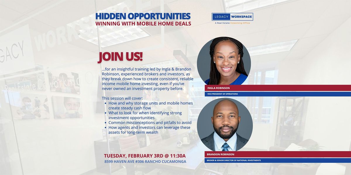 Join us for an insightful training led by Ingla & Brandon Robinson, experienced brokers and investors, as they break down how to create consistent, reliable income through mobile home investing, even if you’ve never owned an investment property before.