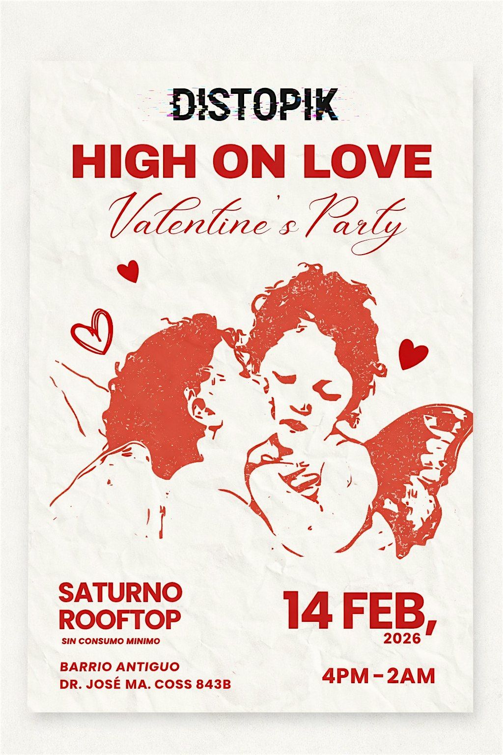 Este 14 de febrero, DistopiK presenta High on Love, un evento que celebra la música, la conexión y la energía colectiva que nos ha traído hasta aquí. Nuestro sexto evento marca un nuevo capítulo para una comunidad que no deja de crecer, consolidándose como un espacio donde lo más importante es vivir una experiencia auténtica, accesible y de calidad, sin consumo mínimo, poniendo siempre a la gente y a la música en primer lugar.
