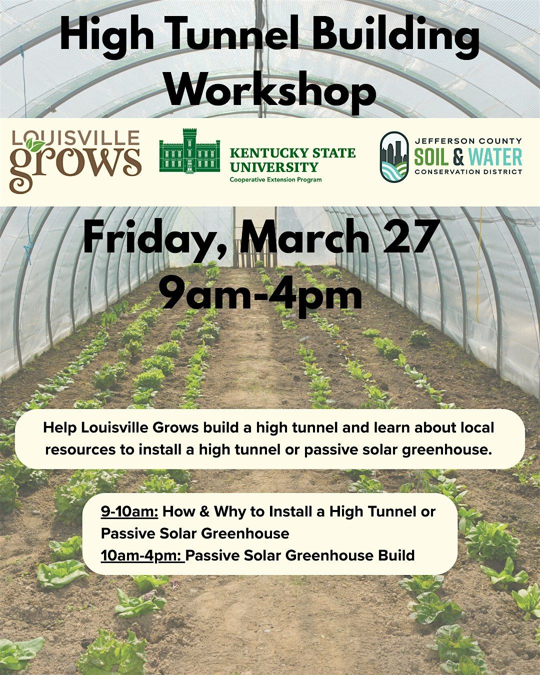 Help Louisville Grows build a high tunnel and learn about local resources to install a high tunnel or passive solar greenhouse.About this Event