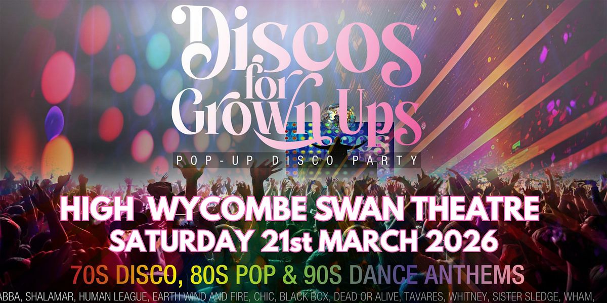 The legendary DISCOS FOR GROWN UPS 70s 80s 90s disco party is coming to The High Wycombe Swan Theatre on Saturday 21st March 2026 for an incredible boogie night to remember!