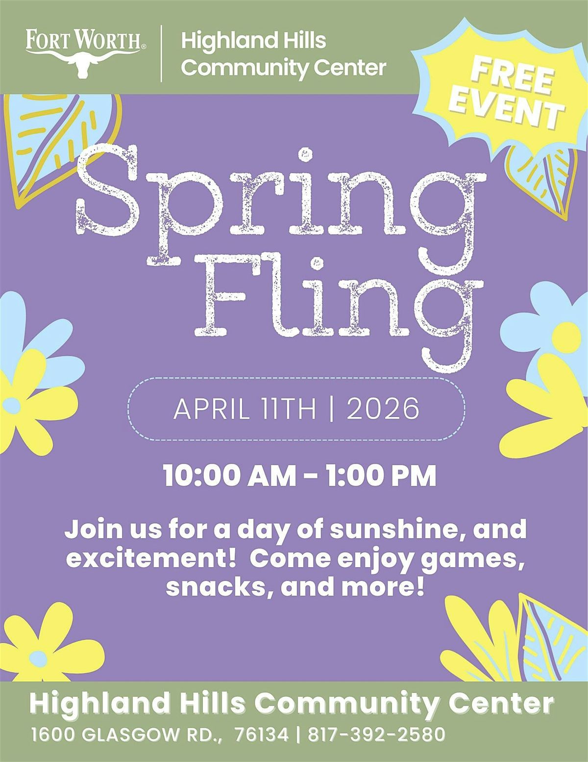 Join us at Highland Hills Community Center for our Spring Fling on April 11th from 10 AM – 1 PM! Bring the whole family out for a fun-filled day featuring games, tasty refreshments, and an adorable petting zoo.
