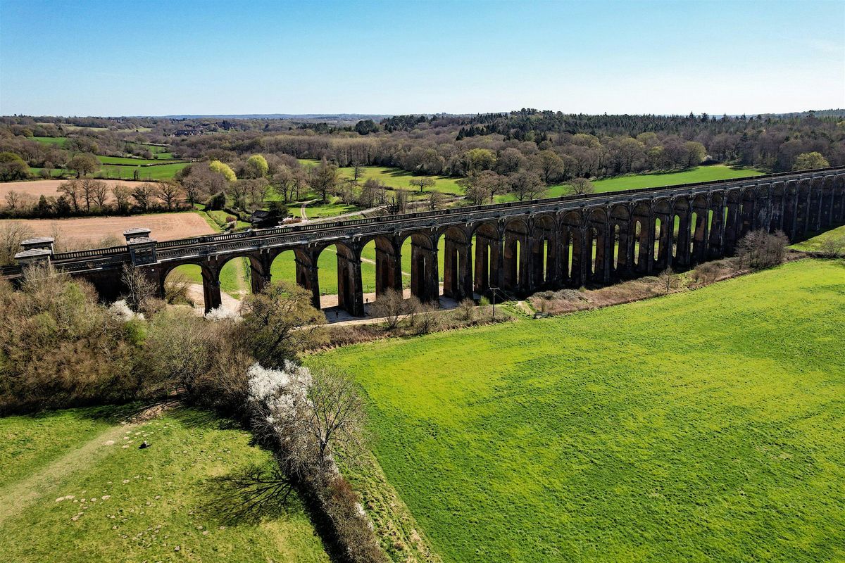 Our hike begins from the rural station of Balcombe, leading us straight into the rolling fields and wooded trails of West Sussex. The highlight comes early as we pass under the spectacular Ouse Valley Viaduct, often described as the most beautiful viaduct in England. Built in 1841 at a cost of £38,500, its 37 arches and 11 million imported bricks create a striking and photogenic landmark — a perfect stop for photos beneath its “never-ending” symmetry.