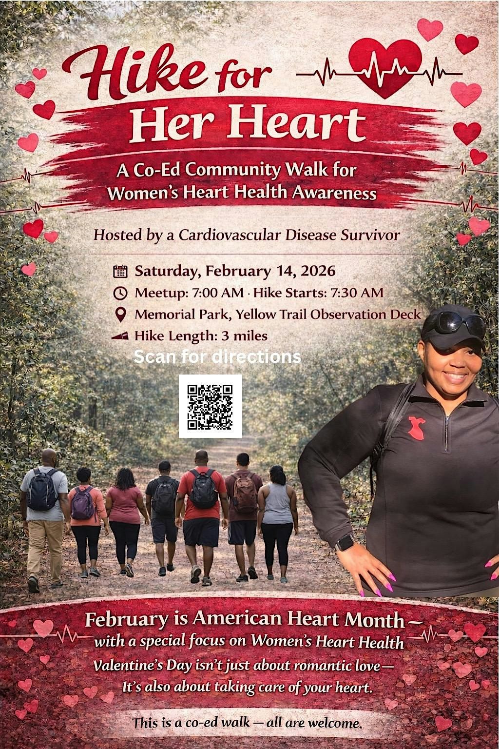 Whether you're a hiking pro or just want a chill day outside, this event is perfect for everyone. Bring your family, your friends, your energy, and your love for adventure. The hike will be guided by a designated hike lead, allowing participants to experience the trail at a comfortable, steady pace. While the hike itself is guided, the event is hosted by a cardiovascular disease survivor and organized in recognition of American Heart Month.