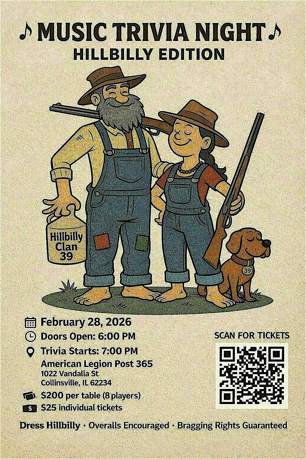 Get ready for a fun night out with Hillbilly Clan #39 Music Trivia! Join us in person to test your knowledge of all things music, from classic hits to modern jams. Whether you're a trivia pro or just looking for a good time, this event is perfect for music lovers who want to show off their skills and enjoy some friendly competition. Don’t miss out on the laughs, tunes, and good vibes! Bring your own snack!