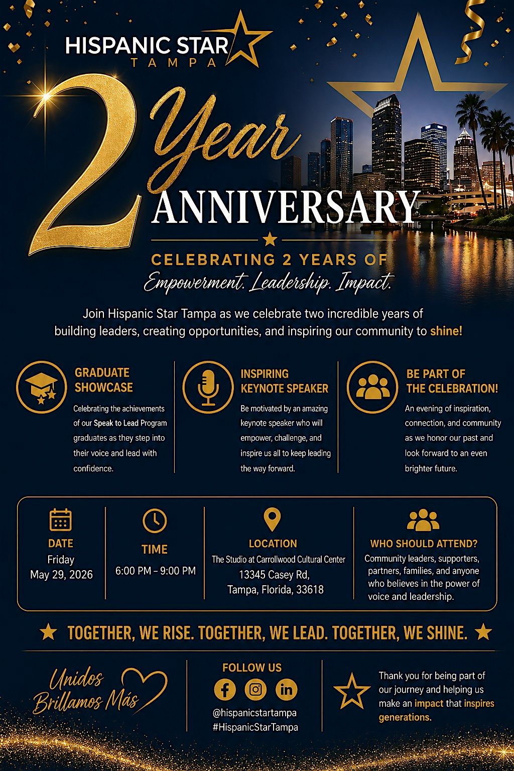 Acompáñanos en el 2º Aniversario de Hispanic Star Tampa. Será una noche especial para celebrar dos años de impacto, liderazgo y crecimiento comunitario en Tampa Bay. Disfrutaremos de la presentación de nuestros graduados del programa Speak to Lead, una inspiradora conferencista y la oportunidad de conectar con líderes comprometidos con nuestra comunidad.