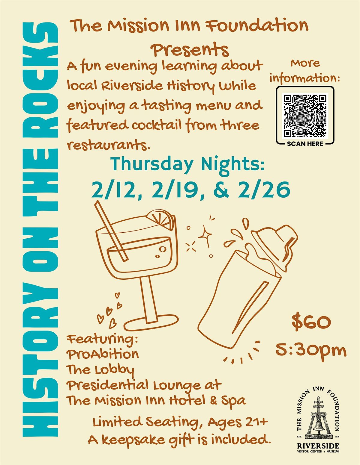 A fun evening learning about local Riverside History while enjoying a tasting menu and featured cocktail from three restaurants. Please note: food selections are chef's choice and cannot be customized for dietary preferences.
