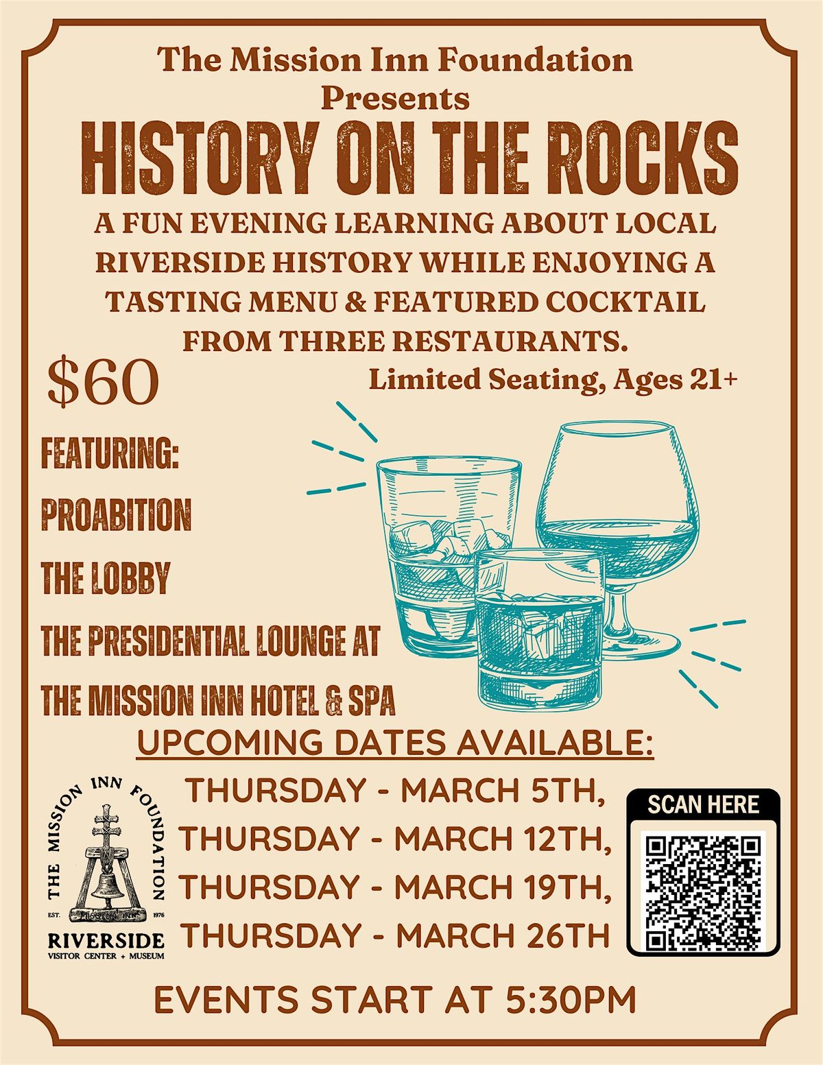 A fun evening learning about local Riverside History while enjoying a tasting menu and featured cocktail from three restaurants. Please note: food selections are chef's choice and cannot be customized for dietary preferences.