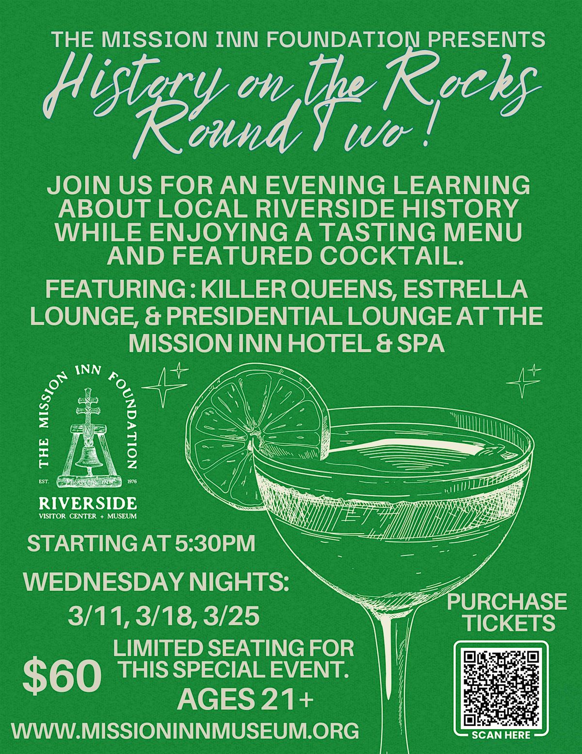 A fun evening learning about local Riverside History while enjoying a tasting menu and featured cocktail from three restaurants. Please note: food selections are chef's choice and cannot be customized for dietary preferences.