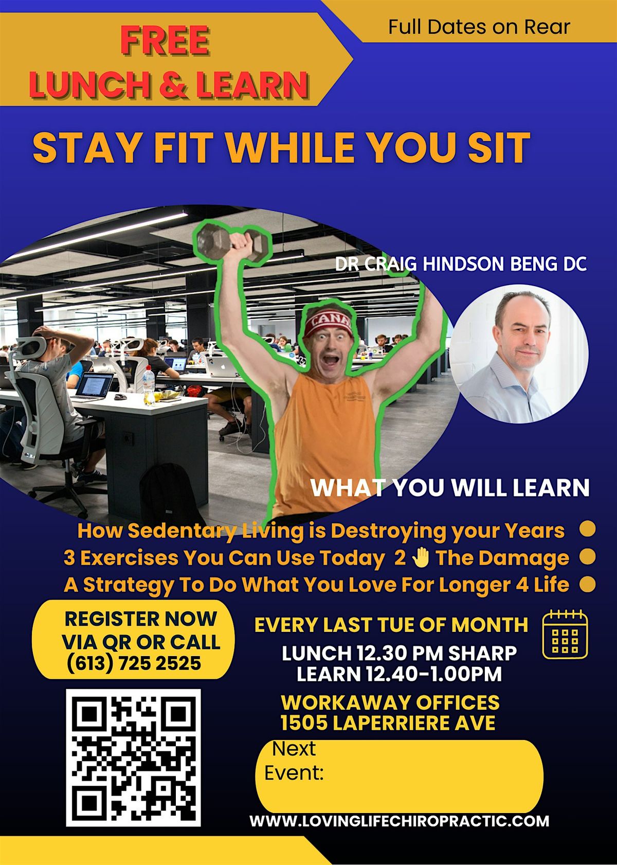 I am a family chiropractor in Ottawa Dr Craig Hindson of Loving Life Chiropractic in Westboro. After recovering my health from serving in my 3rd war zone in 2003, I retrained as a doctor to help people from all walks of life, move better, think better, eat better, and rest better ... and this is your "Stay Fit While You Sit" - Lunch and Learn Event :)