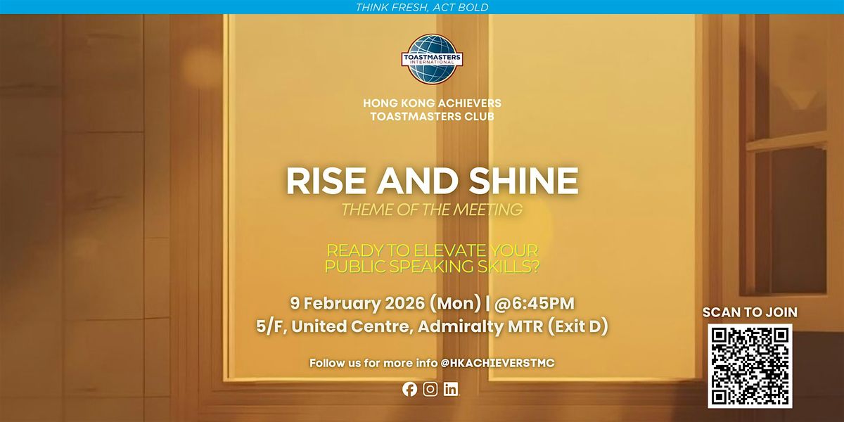 Join us this Monday at Hong Kong Achievers Toastmasters Club as we embrace the theme “Rise and Shine,” celebrating personal growth, positivity, and the power of speaking from the heart. Let’s inspire, uplift, and shine together!