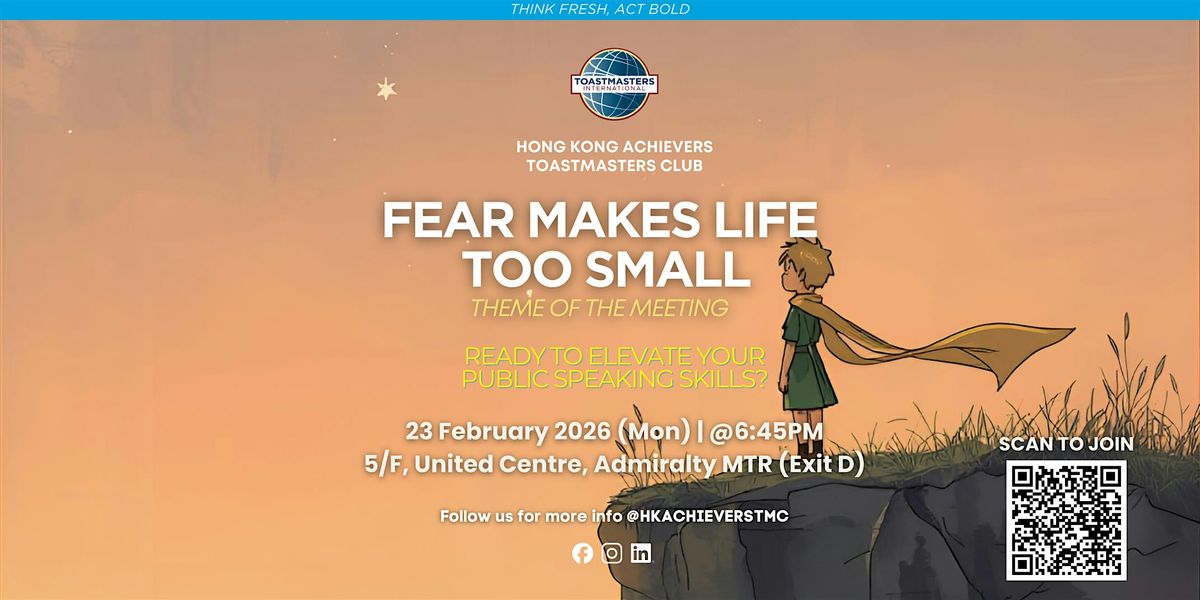 Join us this Monday at Hong Kong Achievers Toastmasters Club as we dive into the theme “Fear Makes Life Too Small.” Discover how courage, vulnerability, and authentic expression can open doors to endless possibilities — both on and off the stage.