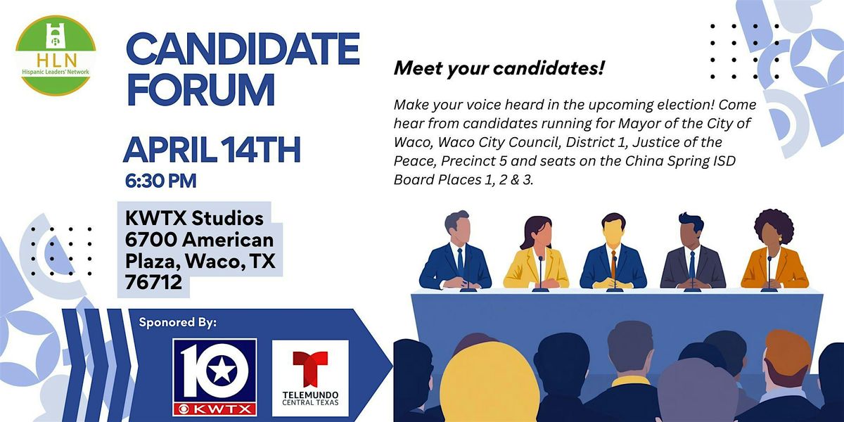 Don’t miss this opportunity to hear directly from the candidates, learn about their platforms, and stay informed on the issues that matter most. Hosted by the Hispanic Leaders Network and sponsored by KWTX and Telemundo Central Texas.
