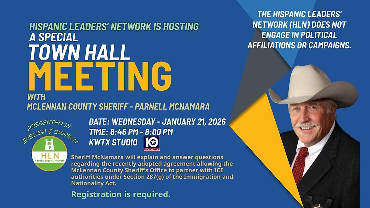 Join the Hispanic Leaders’ Network (HLN) for a special Town Hall Meeting with McLennan County Sheriff Parnell McNamara. This bilingual (English & Spanish) community conversation will provide an overview of the recently adopted agreement allowing the McLennan County Sheriff’s Office to partner with ICE under Section 287(g) of the Immigration and Nationality Act.