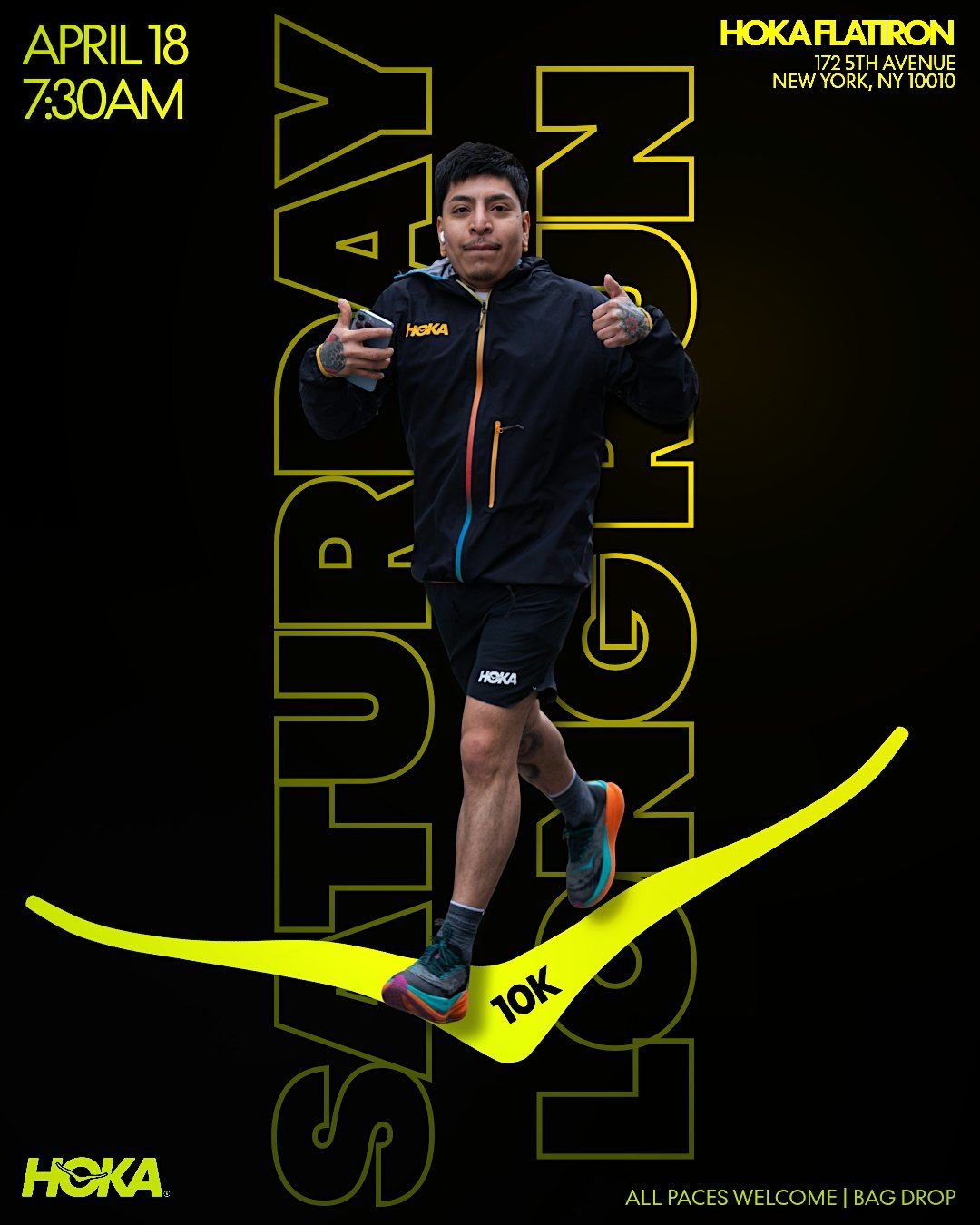 Event DetailsDate: Saturday, April 19Time: 7:30 AMDistance: 10K (6.2 miles)Start & Finish: HOKA Flatiron — 172 5th Avenue, New York, NY 10010