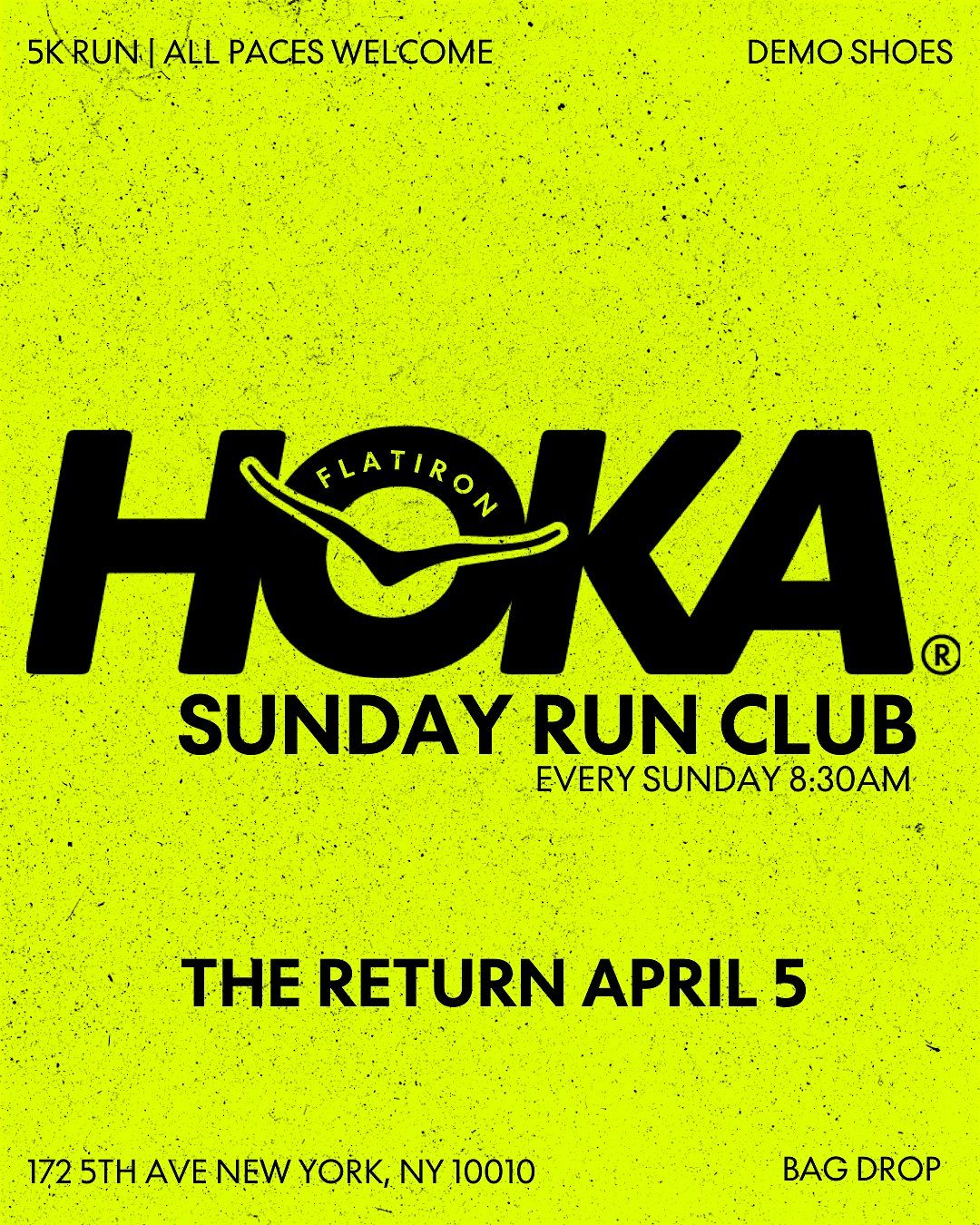 Weather: Rain or shine (we only cancel for severe weather - check @hokaflatironnyc on Instagram for updates)