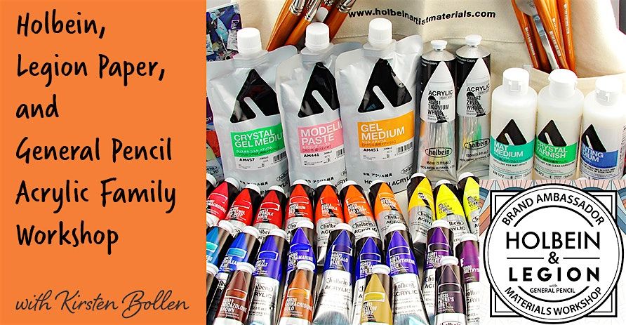 The Acrylic Family Workshop will focus on several types of acrylic paint, including Holbein’s Heavy Body Acrylic, Fluid Acrylic, Acrylic Ink, “Mat” Matte Acrylic, Colored Gesso, and Acrylic Mediums, as well as Legion’s 100% cotton Stonehenge Aqua White and Black papers, Yupo White paper, and an assortment of General Pencil materials.