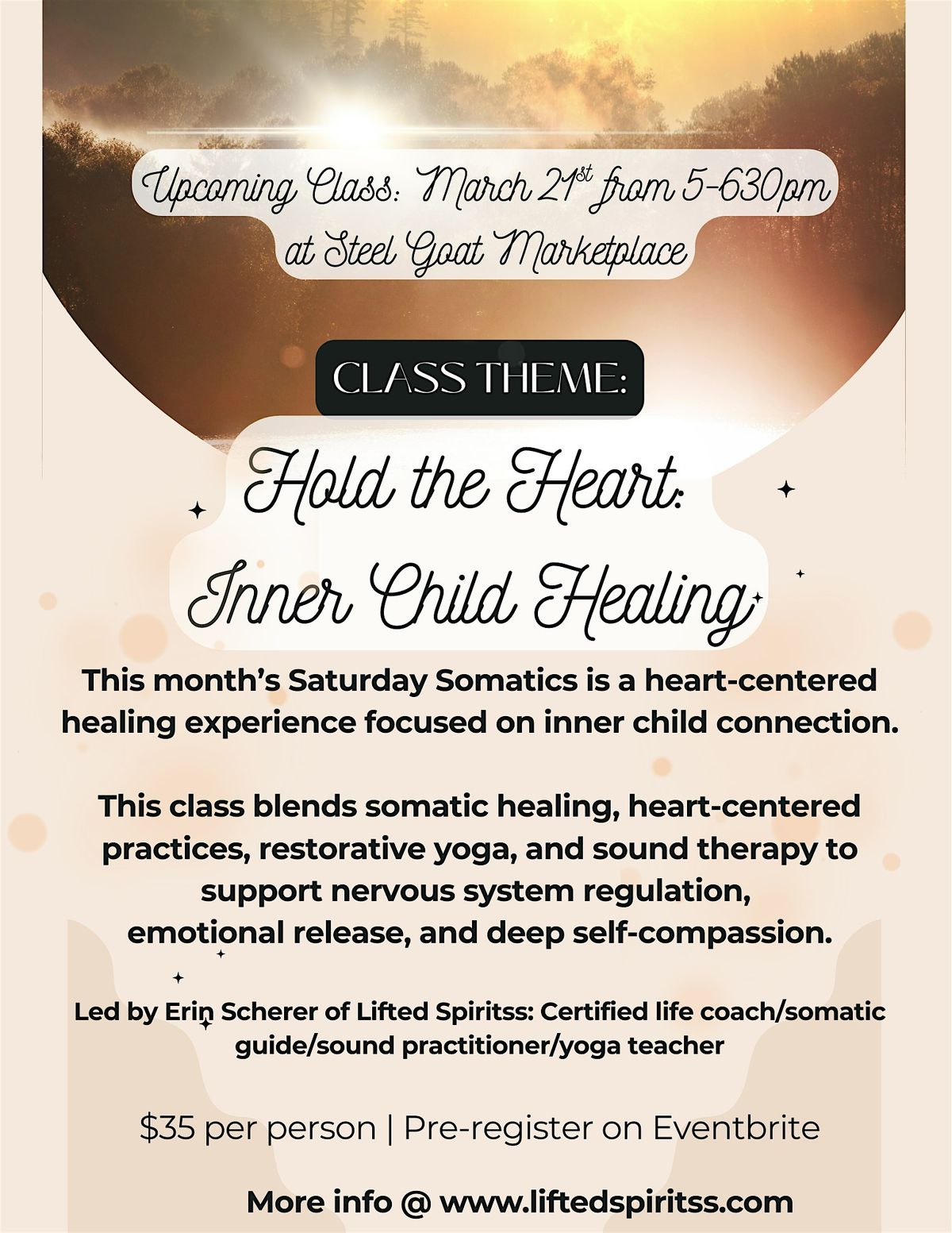 This months Saturday Somatic class blends somatic healing, heart-centered practices, restorative yoga, and sound therapy to support nervous system regulation, emotional release, and deep self-compassion.