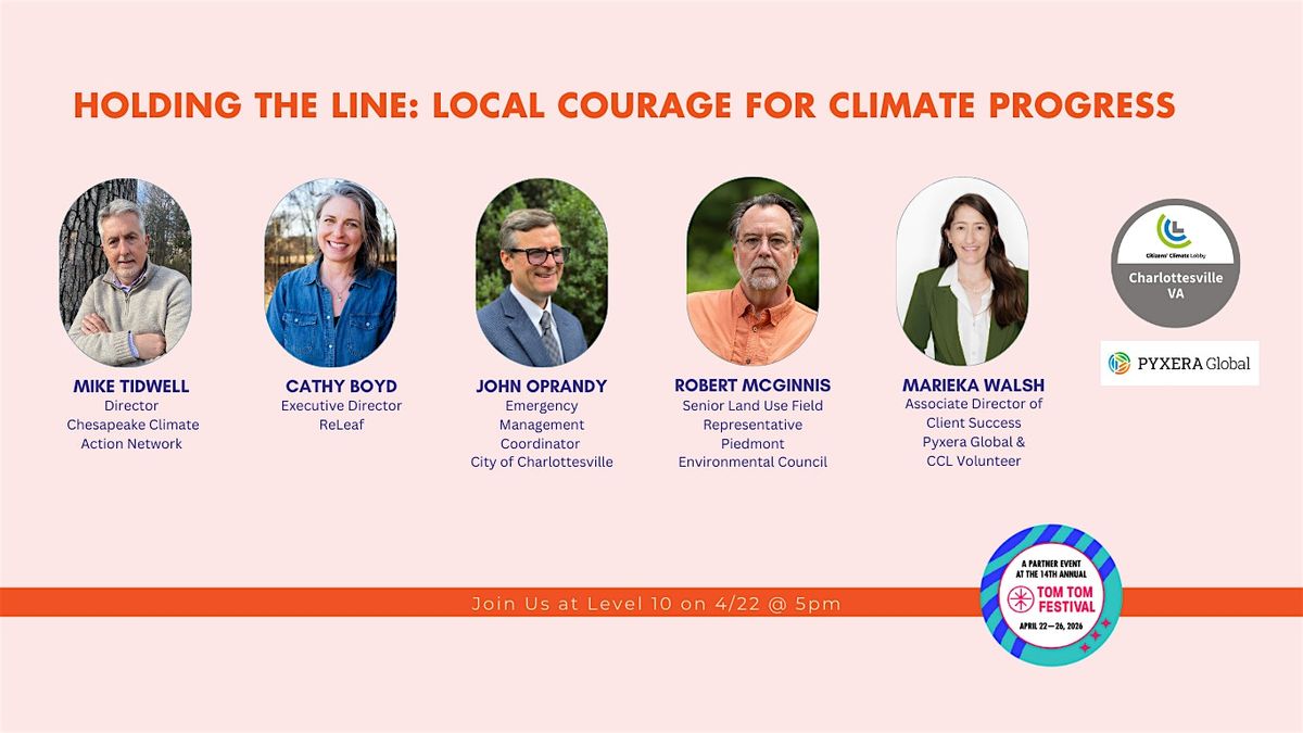 Join neighbors, local leaders, and newcomers alike for an energizing evening focused on practical climate solutions—plus take in views of the Charlottesville skyline from Level 10. As national climate efforts stall, local action, and courage has never mattered more. This event, co-hosted by CCL-Charlottesville and Pyxera Global, spotlights local leaders and the real work happening right here to advance cleaner energy, smarter development, and healthier neighborhoods.