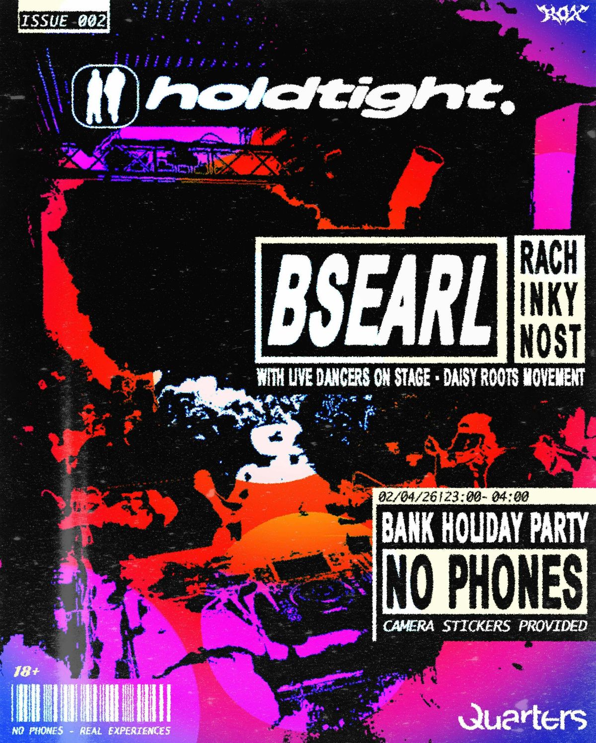 holdtight. presents BSEARL // Easter Bank Holiday // No Phones PartyBSEARL is quickly becoming one of the most exciting new names in UK bass music thanks to his pioneering emotionally-driven synth-heavy garage sound. Coming up through his involvement with Gemfest founders PullUp Recordings, his high-energy sets blend UKG, bassline and club-ready heaters which are set to sound massive at a holdtight party.What is holdtight.?Brighton’s first no phones party.Easter Bank Holiday Thursday at Quarters ❤️🔥02/04/2623:00-04:0Headliner: BSEARL📵 Brighton’s first main room club no phones party (camera stickers provided)❤️🔥 Huge headline act💃🏽 The scenes best pro dancers on stage🖨️ Physical art and print you can take home✨ Real human experiences. Away from AI. Away from technologyA night of the best uk and underground dance music.Lineup:BSEARLTBCRACHINKYNOST It’s about living in the moment, away from AI. Away from technology. It’s about real human experiences.It’s about culture, supporting community, connection and safe spaces for expression.It’s about bringing a level of production that hasn’t been seen in Brighton for a very long time. From additional lighting and moments of theatre throughout the night to dancers and physical memorabilia you can take home.It’s about what a party is supposed to feel like.Disclaimer: