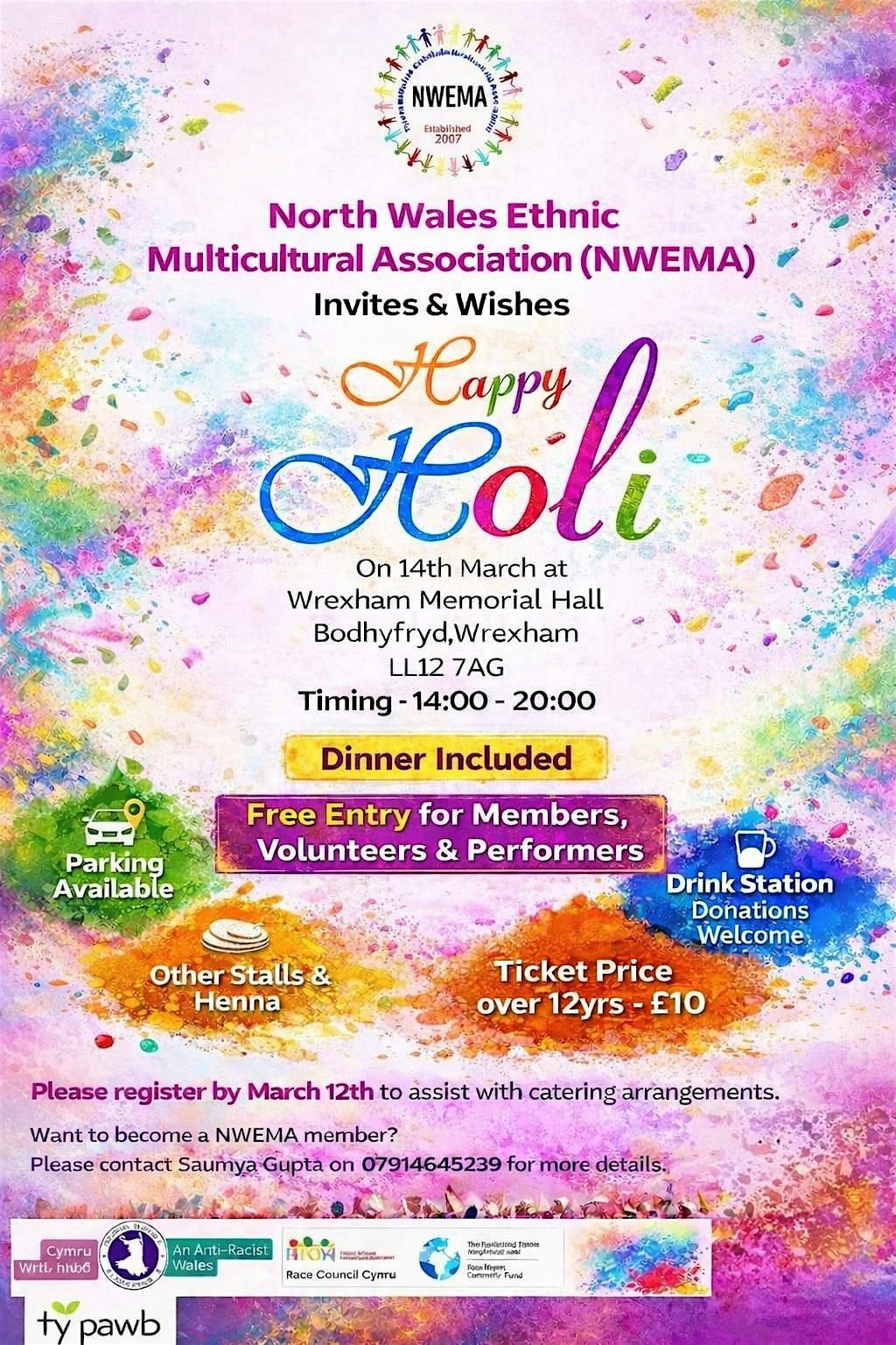 Welcome to the Holi 2026Â celebration with North Wales Ethnic Multicultural Association! Join us at the Wrexham Memorial Hall for a night of joy, colours, and cultural festivities. Get ready to experience the vibrant colours, delicious food, and traditional music that make Holi so special. This in-person event promises to bring our community together in a spirit of unity and celebration. Don't miss out on this opportunity to immerse yourself in the excitement of Holi with friends and family. We can't wait to celebrate with you!