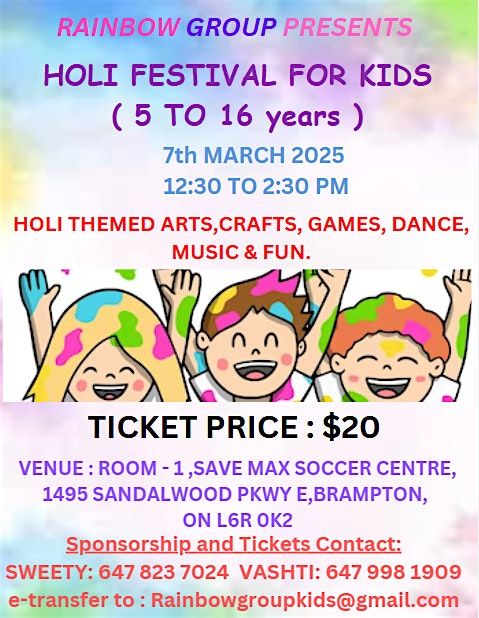 HOLI FESTIVAL for Kids ( 5 TO 16 years ). Arts, crafts, games, music & dance, Light snacks, Holi Vibes . March 7, 12:30–2:30 PMAbout this Event