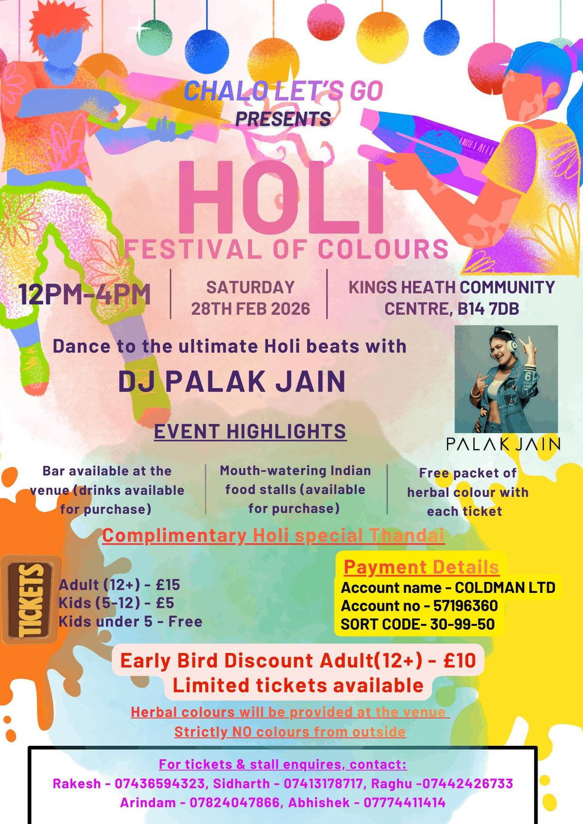 Celebrate Holi with music, colours & community! Free herbal colour, complimentary Thandai, DJ beats & family fun.Celebrate the vibrant Holi Festival of Colours with Chalo Let’s Go at a fun-filled, family-friendly event in Birmingham!